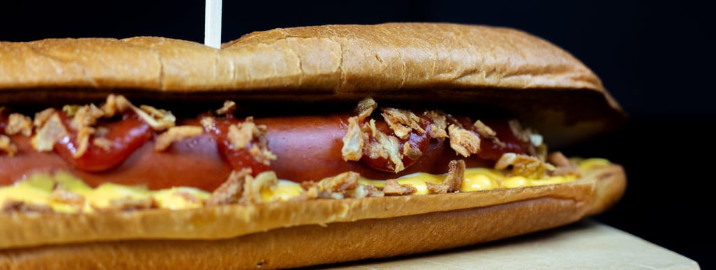 telečja hrenovka v prerezani brioch štručki, topljeni sir, pražena čebula, jalapeno