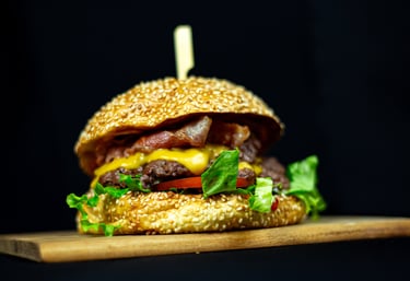 bombetka s sezamom, 200g 100% govedina z angusom, cheddar sir, solata, paradižnik, kumare, hrustljava čebula in sirova omaka