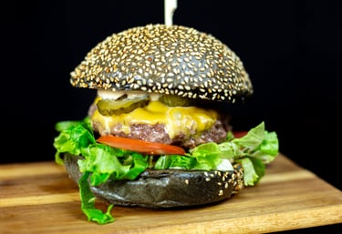 črna bombetka s sezamom, 200g 100% govedina z angusom, cheddar in dimljen sir, solata, paradižnik, slanina, čebula, jalapenjo in bus stop omaka