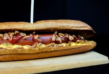 telečja hrenovka v prerezani brioch štručki, BBQ, topljeni sir, slanina